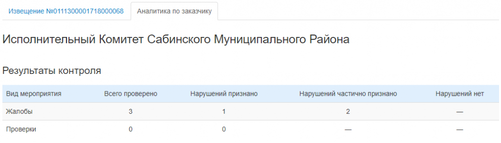 Раздел Результаты контроля вкладки Аналитика по заказчику показывает общее число жалоб и проверок по конкретному заказчику, количество признанных, не признанных и частично признанных нарушений.