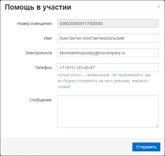 Чтобы найти на них ответы мы добавили простой способ обратиться за помощью к нашим тендерным специалистам — в полную карточку процедуры добавили кнопку Помощь в участии, при нажатии на нее открывается форма с заполненными полям: информацией о закупке и вашими контактами.
