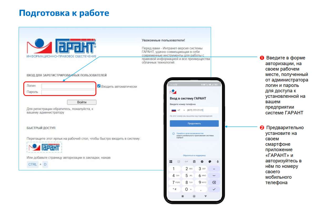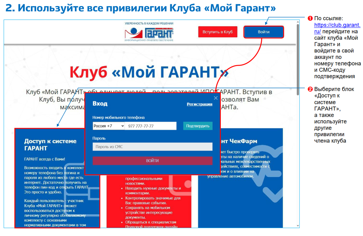 Он предоставляет возможность доступа к системе ГАРАНТ по номеру телефона без логина и пароля из любого места, где есть интернет. Достаточно получить на телефон пин-код и открыть ГАРАНТ. Это просто и удобно!