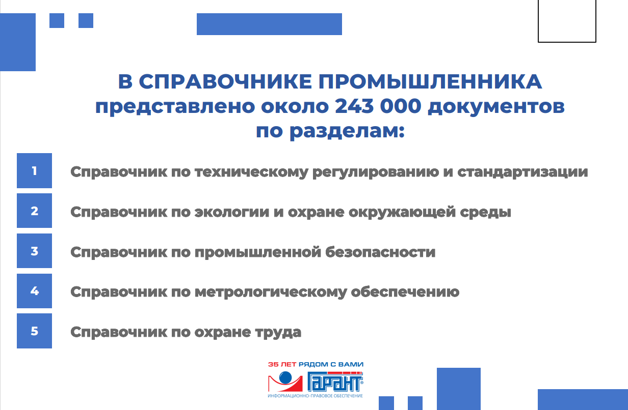 Справочник промышленника – это актуальные стандарты и нормативы для специалистов различных отраслей промышленности. Сотни тысяч документов по техническому регулированию, охране труда, метрологическому обеспечению, экологической и промышленной безопасности, включая: